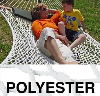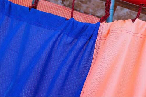 Polyester is a common material for mesh-style hammocks. You often see these polyester rope hammocks hung between two palm trees. They’re very durable and hard to fade.