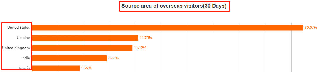 Yiwugo is primarily used by the Chinese, with only 10% of users coming from outside China. Based on the latest 30-day overseas visitor data released by Yiwugo, the majority of overseas visitors are from the US, the UK, Ukraine, India, and Russia.