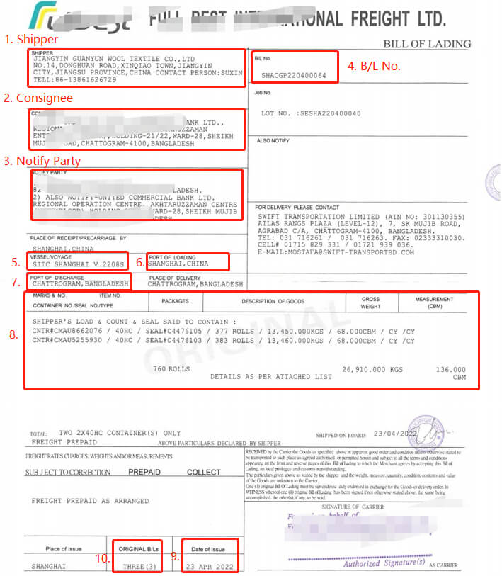 The BL form varies from one shipping company or freight forwarder to another one. However, the contents of BL are basically the same. You’ll find a series of key info on any bill of lading.