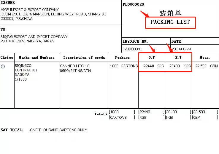 Note the following 3 types of shipping documents must include the net weight and gross weight of the goods.