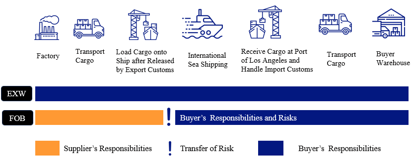 The main difference between Ex Works (EXW) and Free On Board (FOB) lies in whether the supplier is responsible for export customs declaration, transporting the goods to the nearby port, and bearing the associated costs and risks during this process. Here is an “EXW vs FOB” infographic for visual understanding.